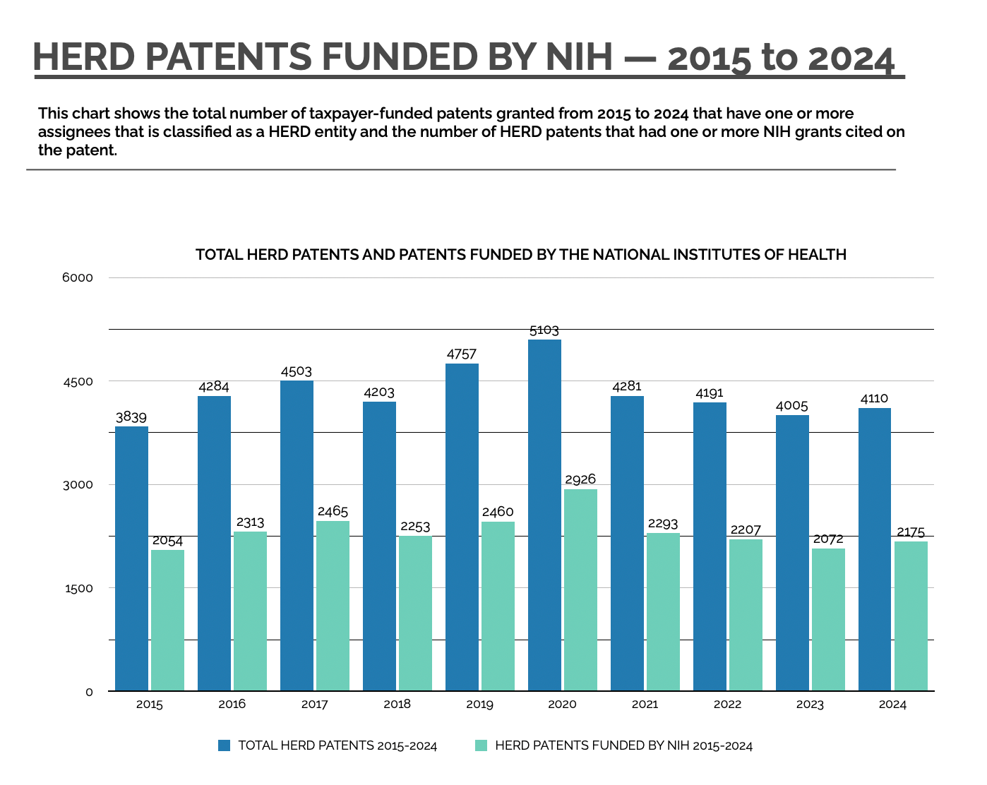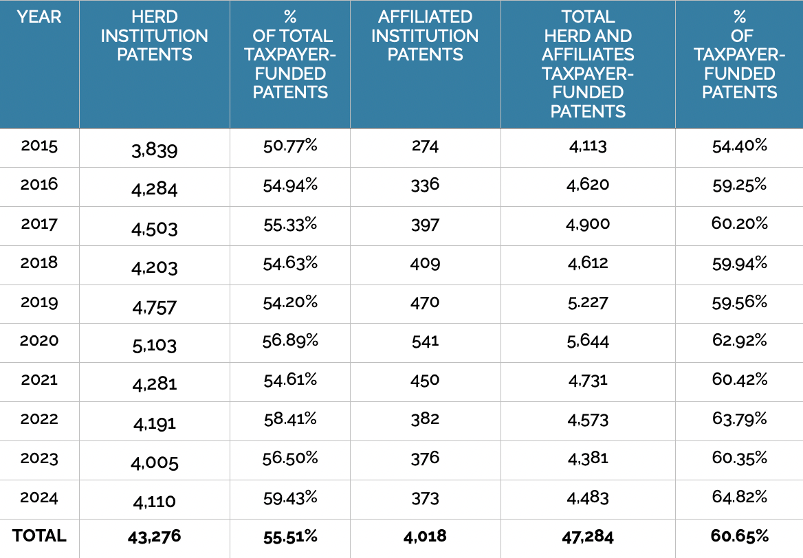 The table shows patents received by HERD-affiliated entities and the reach of HERD entities and their affiliates receiving taxpayer-funded patents.