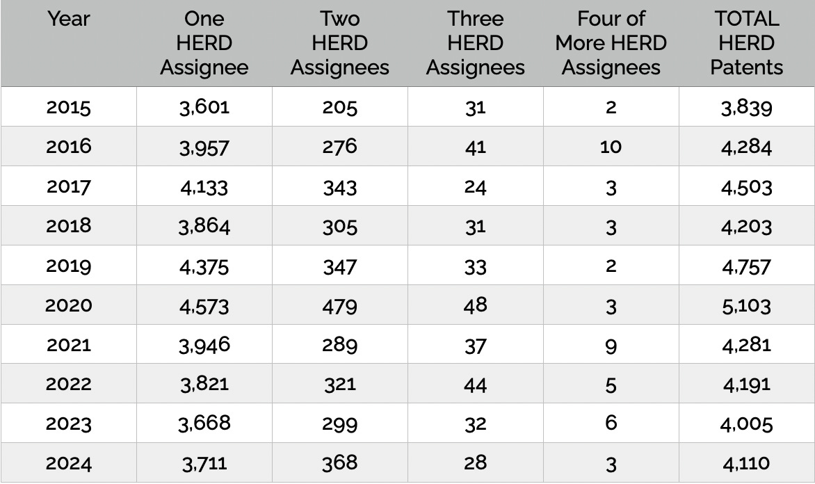 While 92% of the HERD patents assigned to a university or college have a single HERD assignee, 3,627 patents have two or more HERD assignees that share ownership of the inventions.