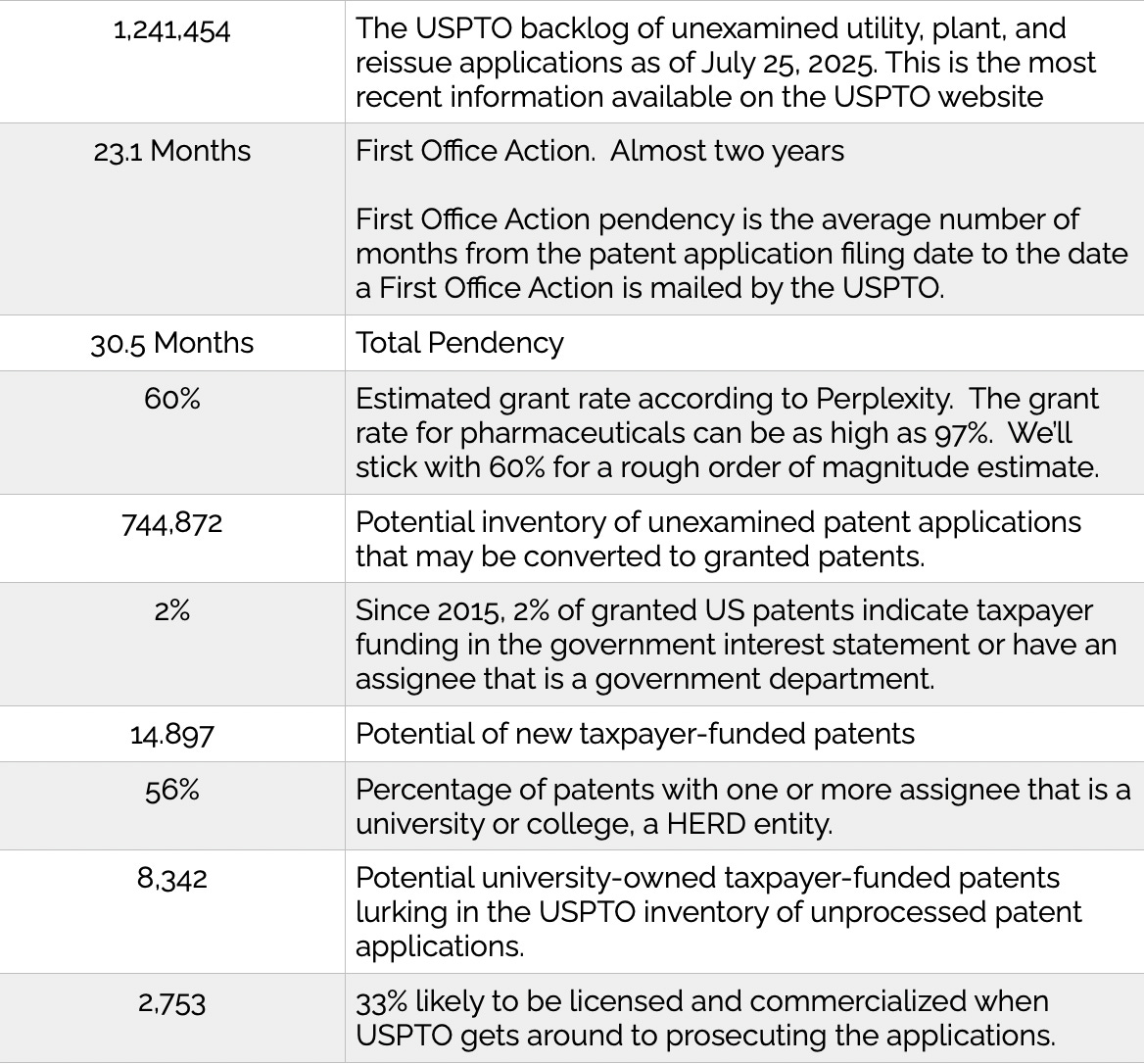 To make our point, here is a little back-of-the-envelope math on the potential HERD patent application backlog.
