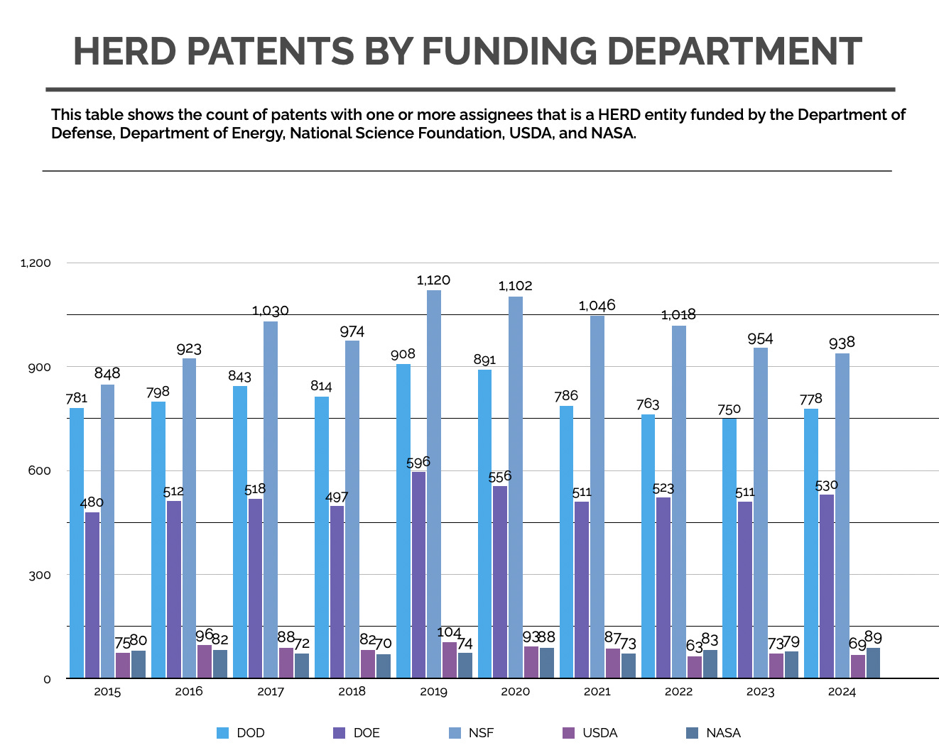 HERD patents cite 24,919 grants or contracts that were the source of funding from the Department of Defense (8,112), Department of Energy (5,234), National Science Foundation (9,953), USDA (830), and NASA (790). The table chart below shows these citations year over year.