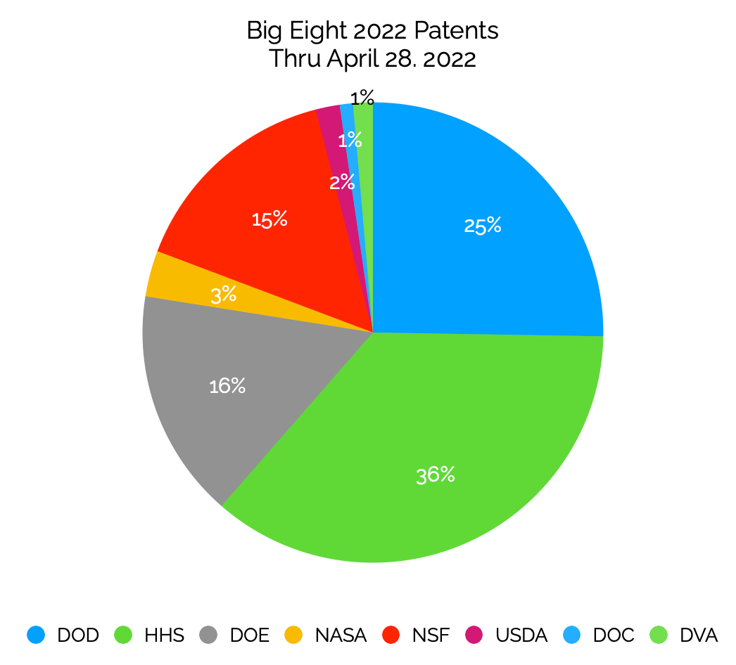 Another Disclaimer: The patents counted in the tally can be credited to more than one agency because an inventor can have funding from more than one agency — HHS and DOD or NSF and DOE.