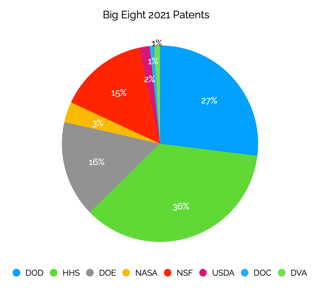 We have a complete dataset for 2021 taxpayer-funded patents. (As complete as anything patent-related can be.) We were curious about how the 2021 patents for the big eight departments broke down. So we made a pie chart.